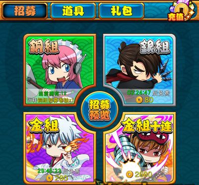伙伴招募分为铜组、银组、金组和金组十连四种方式,选择不同招募方式所需的费用各不相同,同样得到伙伴的品质也有所差异,简单的说铜组招募虽然有几率获得S级别(紫)伙伴但几率低的可怜,一般只能获得A级(蓝)别伙伴。而金组招募则有极大几率获得S级甚至SS级的伙伴,详细信息可以查看中间的招募预览。