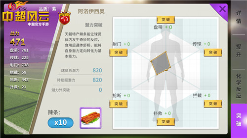 当然在《中超风云》手游中,玩家不仅能调整阵容、战术,也能对球员进行定向培养。以山东鲁能的阿洛伊西奥为例,如果你觉得他的拦截能力还有待提高,就可利用球员系统中的突破玩法,直接提升其该项能力,简单直接,效果显著!