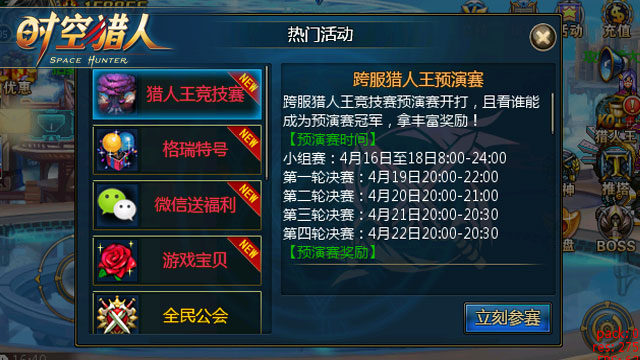 《时空猎人》跨服猎人王预演赛抢先开打,最新颖的对战模式,最激烈的PK赛事,让你体验一场战斗3次对决的快感!自猎人王海选开始以来,各位猎人加紧练习,不知道在此次跨服预演赛中,谁能突破重围成为真正的猎人王!