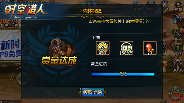 在寻宝广场点击“森林大冒险”即可进入战斗, 2分钟内刷怪越多掉落的奖励越多,有几率掉落富豪宝石。玩家等级越高获得的通关奖励也越高,VIP5以上可翻牌3次,有几率翻得富豪宝石、90级红色特效装备箱、勇者宝石、猎人宝石、巨额竞技点等等奖励!
