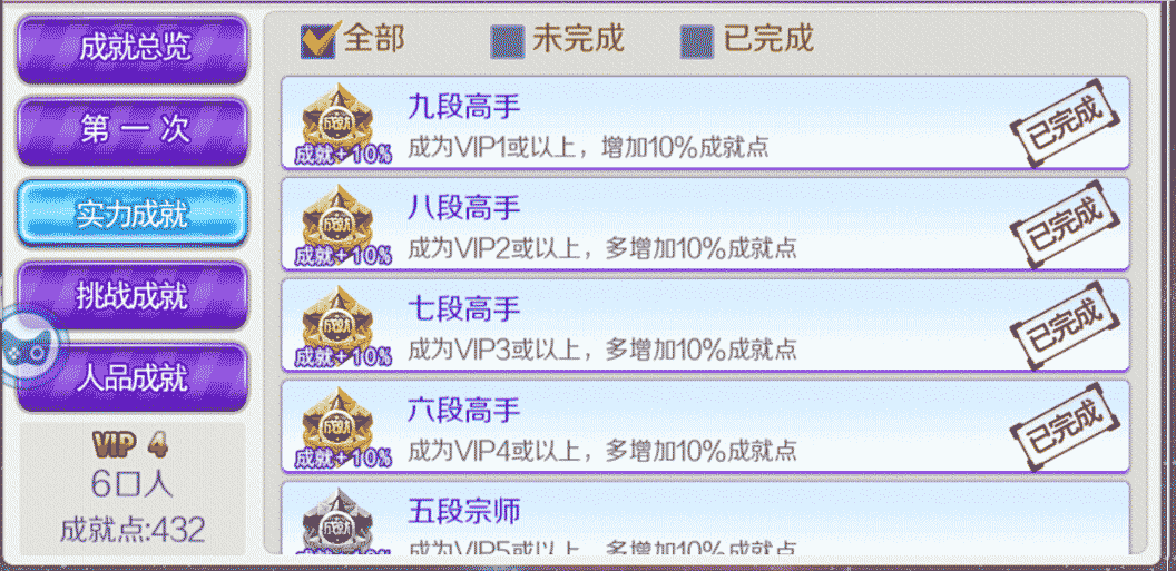 成就系统是《超级宗师》的独创特色玩法,让一些对自我有更高挑战的玩家设立的。这个系统与大部分网游设定并无大致,并分为第一次、实力成就、挑战成就、人品成就几个小类。