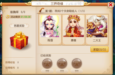 三界奇缘玩法每天中午开启,玩法考察玩家对三界人物的了解程度,需要回答关于三界人物关系的题目。共10道题目,如果回答正确大于等于6道题目,便可以获得奇缘礼包。