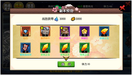 每个关卡战力要求差别都很大,并且每天限定挑战次数,就算你想多打也不行,买不了。同时每次挑战也是需要消耗体力的,准备好足够的体力哦。首次通关给钻石,突破石,体力和魂晶,突破石给人物加点用的非常重要,体力也一样,不够的话用钻石买都是值得的,魂晶给人物升级用的也是必须的。每次刷完副本都会给钻石,人物碎片,玉,突破石。玉是在修炼里面的四魂神龛用的,给对应的攻击,防御,血量灵石升级用的,都是好东西,所以赶紧冲战力来刷精英关卡。