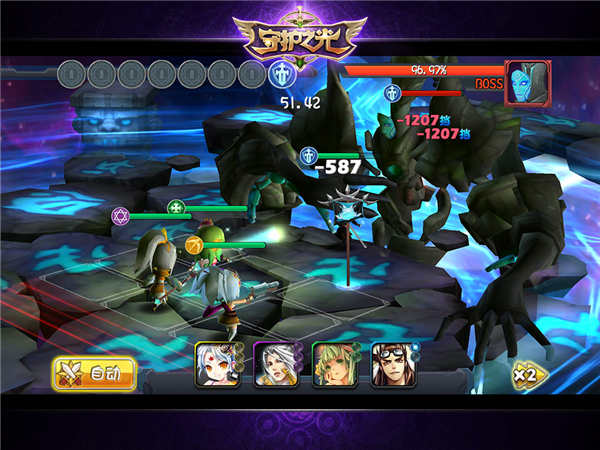由于BOSS有单体和群体攻击,因此战斗过程中走位要求非常高,一个英雄没血了,要立刻拉回来,让别的英雄顶上去。闪避BOSS的局部群攻技能更是要求操作稳准狠!这些风骚的操作都突破了传统卡牌游戏的极限,成为第三代动作卡牌升级版的核心部分。