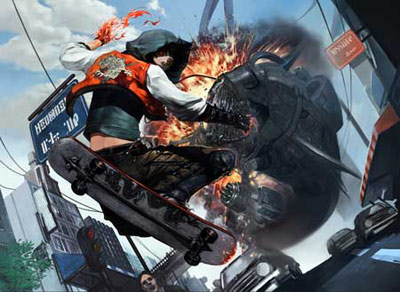 主动技能(冲击波):巴斯蓄积所有的能量,与滑板融为一体朝前方冲击,被冲击的目标会被眩晕,巴斯产生后坐力往回翻滚一段距离,并朝被撞击目标方向发射强烈的冲击波。